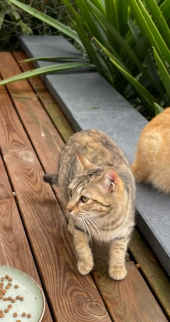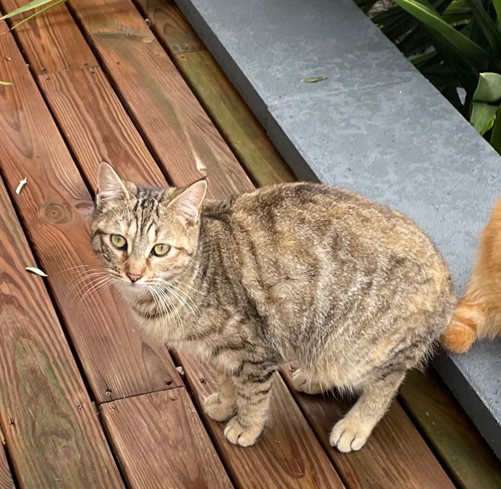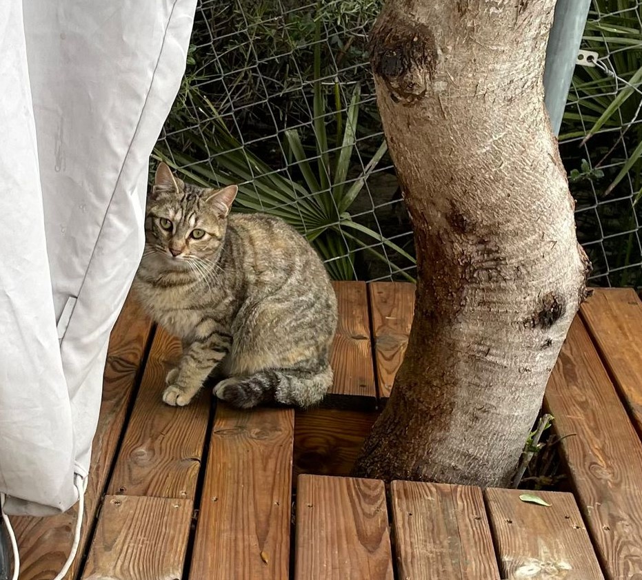Soy un gato macho de 5 años, esterilizado y con buena salud. Me rescataron de la calle después de un accidente y ahora vivo seguro en el jardín de mis padres de acogida, donde he aprendido a confiar en las personas.